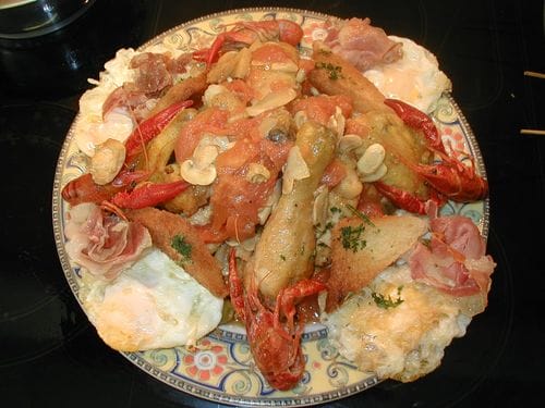 Algunos de los productos con los que los ayudantes regresaron fueron gallinas, cangrejos, vino, tomates, champiñones, etc. Ingredientes con los que aquél cocinero elaboró esa sabrosa y sencilla receta de pollo que después sería llamada Pollo a la Marengo en honor a la victoria conseguida en la batalla homónima.